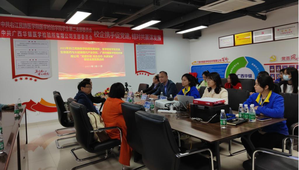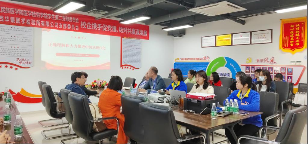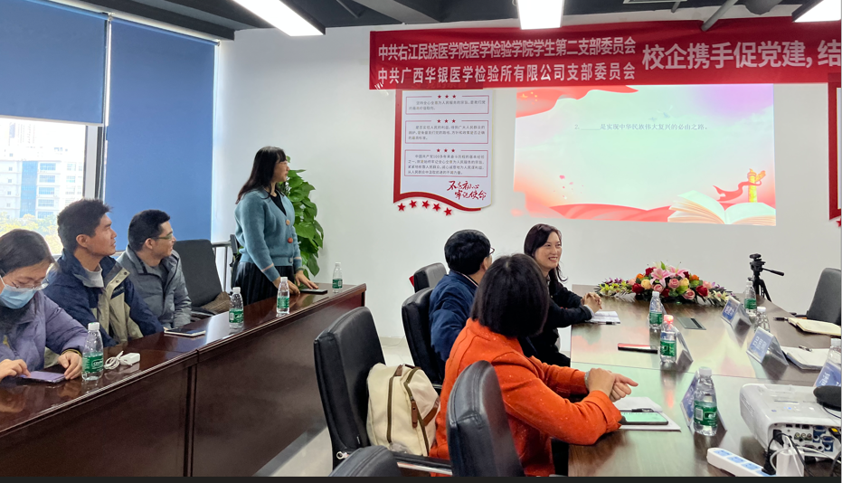 25日,医学检验公司党委、公司人才招聘处党支部、现代产业公司教师党员代表一行,带着太阳成集团tyc122cc2023届毕业生代表前往广西华银医学检验所有限公司开展“校企携手促党建 结对共建谋发展”主题活动。在参观考察公司实验室后,大家一起听了医学检验公司党建组织员陈莎带来的党的二十大精神学习专题党课《正确理解和大力推进中国式现代化》并开展了党的二十大精神主题知识竞赛,最后大家围绕“党建引领 校企合作 共谋发展”主题进行了沟通交流,对访企拓岗、检验毕业生就业、本科生培养等进行了深度商谈,并达成共识将于4月校企合作在百色市开展党建共建、红色基地打卡,在太阳成集团tyc122ccvip太阳成集团tyc122cc开展华银杯病理切片大赛等事宜。