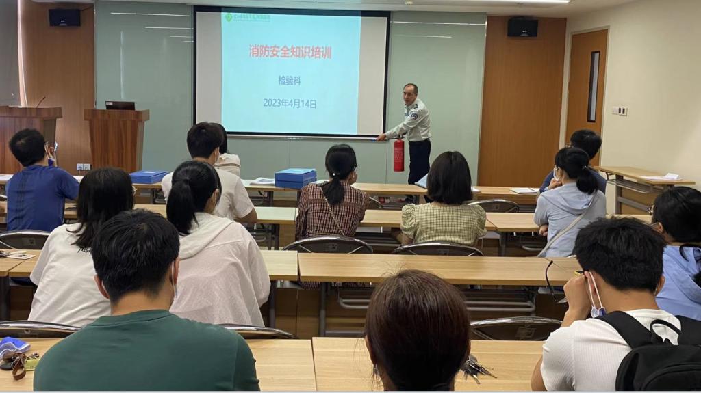 全体实验室人员在集中观看“消防救火警示教育视频”后,由保卫科专业人员对实验室人员进行救火防灾、安全逃生的技能培训,在保卫科同志专业、仔细的讲解、示范下,职工同志们又进一步熟悉了常用灭火器的适用范围、操作步骤、注意事项等知识,最后有两位新员工主动上场对救火流程进行现场操作实训体验。