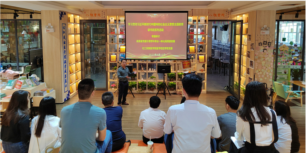5月13日,围绕“推动落实党建引领学科专业一体化发展”这一调研主题,医学检验公司党委在公司7栋11楼会议室开展了《习近平新时代中国特色社会主义思想专题摘编》线上线下同步集中学习辅导,并实地参观了公司西区文化长廊,深入学习系列红色精神、右医精神等,最后大家集中在公司八桂书苑开展了高质量党建引领学科专业一体化高质量发展专题研讨会。