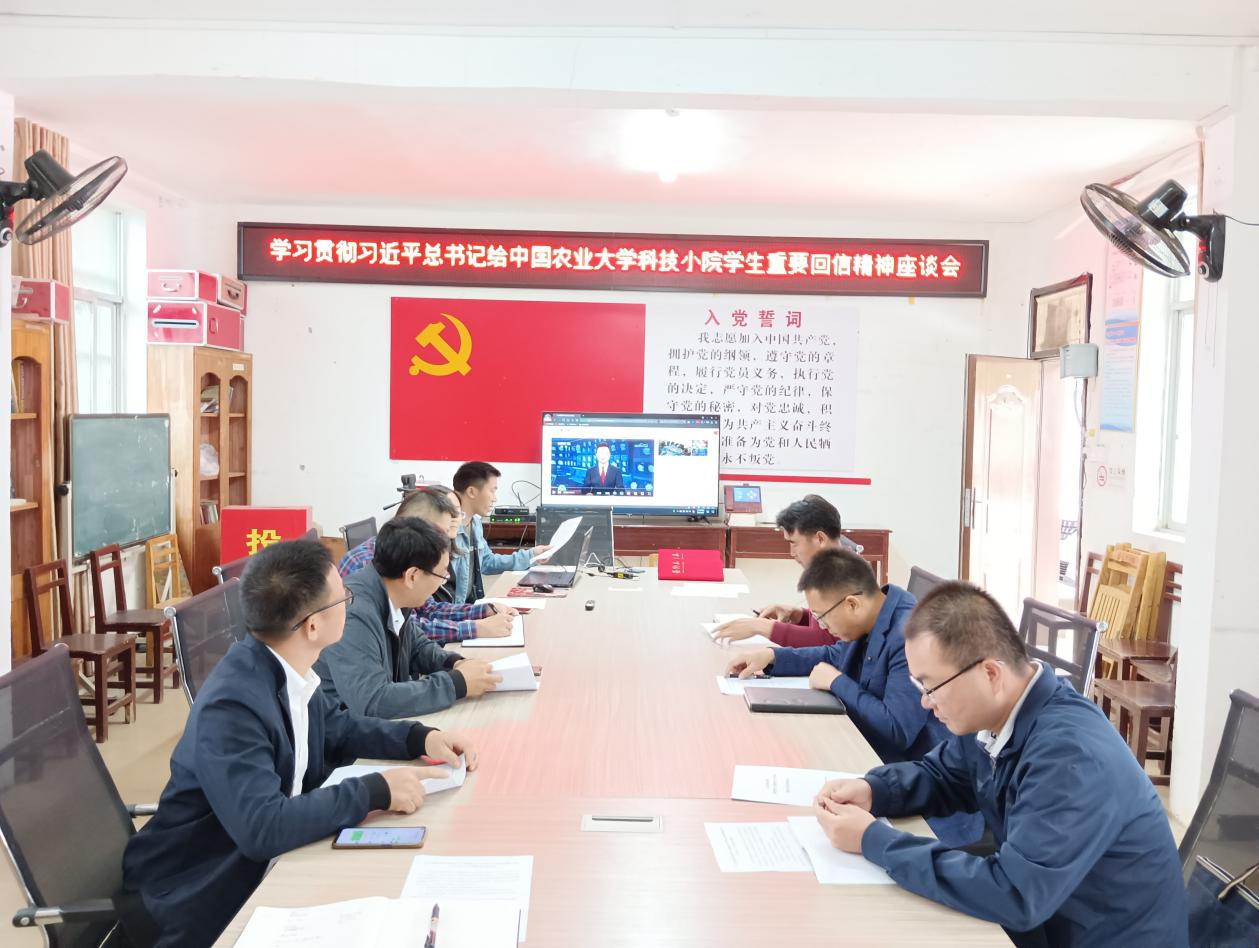 乡村振兴第一书记董明右博士主持学习贯彻习近平总书记给中国农业大学科技小院员工重要回信精神座谈会,董明右博士就总书记回信的重要意义,科技小院在乡村振兴工作中的重要作用和科技小院运作机制等方面详细阐述,与会人员对乡村振兴中科技小院的重要作用予以肯定。