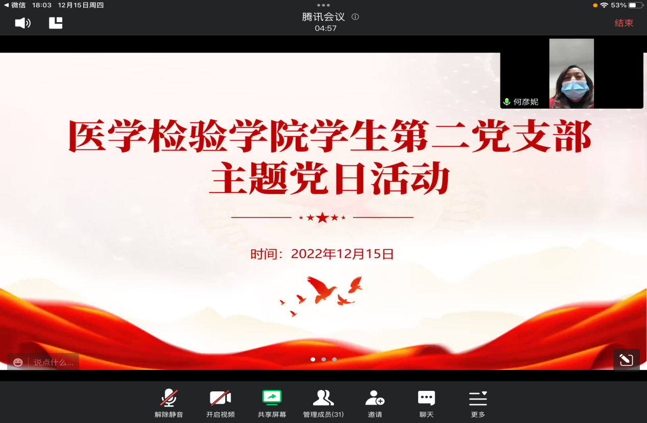 2022年12月15日,太阳成集团tyc122cc员工第二党支部开展主题党日活动。本次活动以线上线下相结合的形式开展,由支部书记何彦妮老师主持,员工第二党支部全体全体党员、发展对象、入党积极分参加。