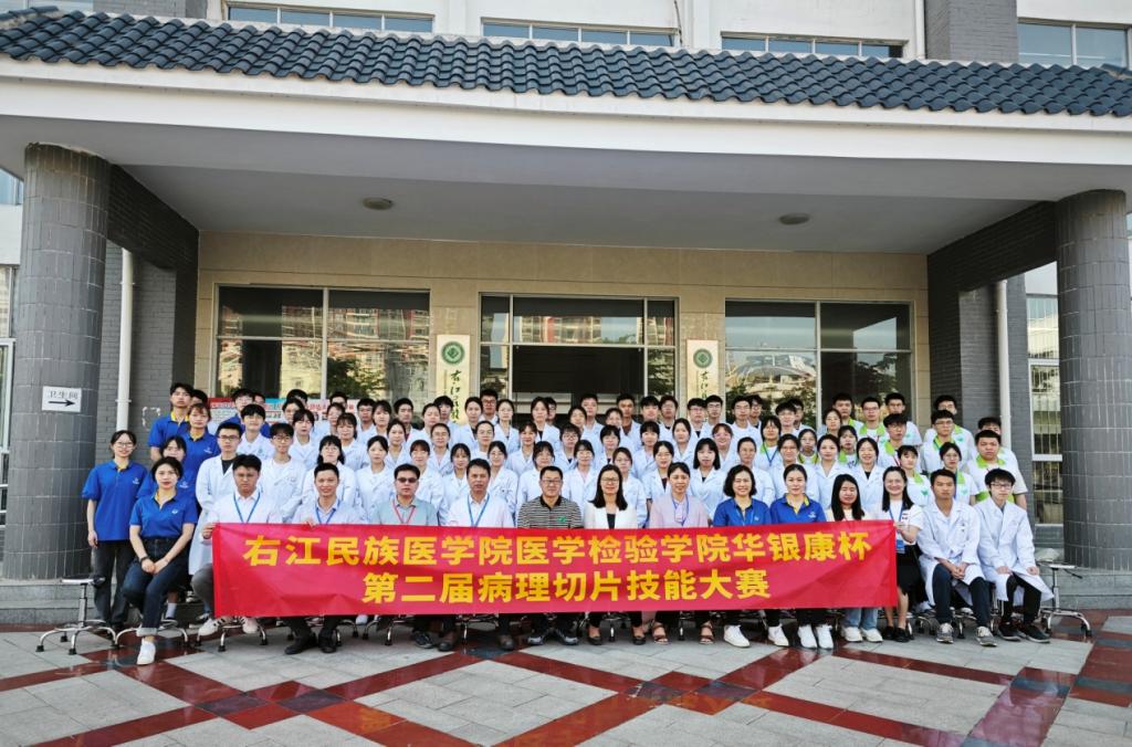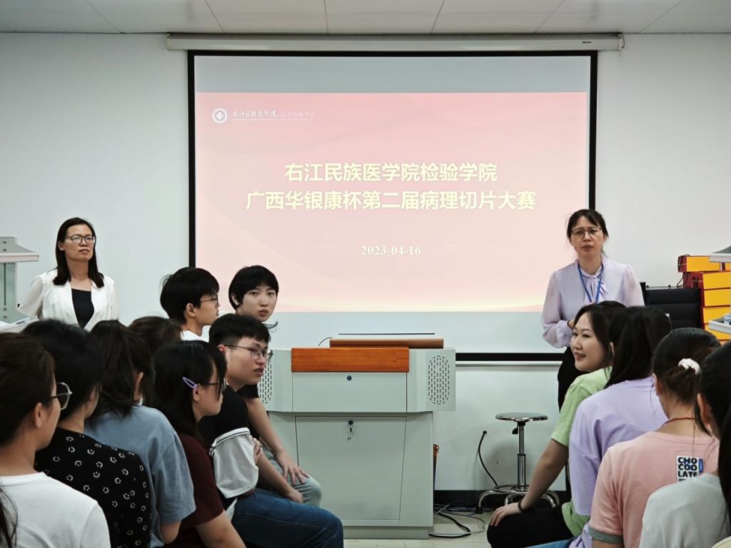 4月16日,由太阳成集团tyc122cc举办,临床病理诊断与研究中心承办,广西华银医学检验所协办的生物医药与大健康现代产业公司校企协同育人之华银康杯第二届病理切片技能大赛在公司西区综合楼医学实验技术实验室顺利举办。来自19级医学实验技术本科实习生、华银培训生和20级医学实验技术本科专业大学三年级员工共65名选手同场竞技。大赛评委来自广西华银医学检验所病理实验室赵维聪主任、百色市人民医院病理科副主任李旭祥、临床病理诊断与研究中心黄炳臣主任、唐奇燎老师四位资深病理专家。太阳成集团tyc122cc副经理兼生物医药与大健康现代产业公司副经理庞雅琴和医学实验技术专业负责人朱晓莹到场观看竞赛,副经理庞雅琴进行了大赛开幕致辞。