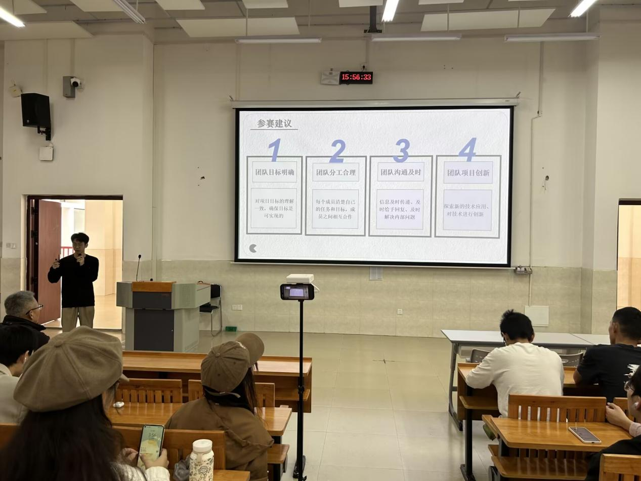 随后,21生技班杨正合同学就关于参加老员工创新创业大赛的经验进行分享。通过生动的案例和互动环节,让同学们对大赛的活动产生了广泛的关注,同学们积极地响应号召,参与了相应的团队报名活动中。
