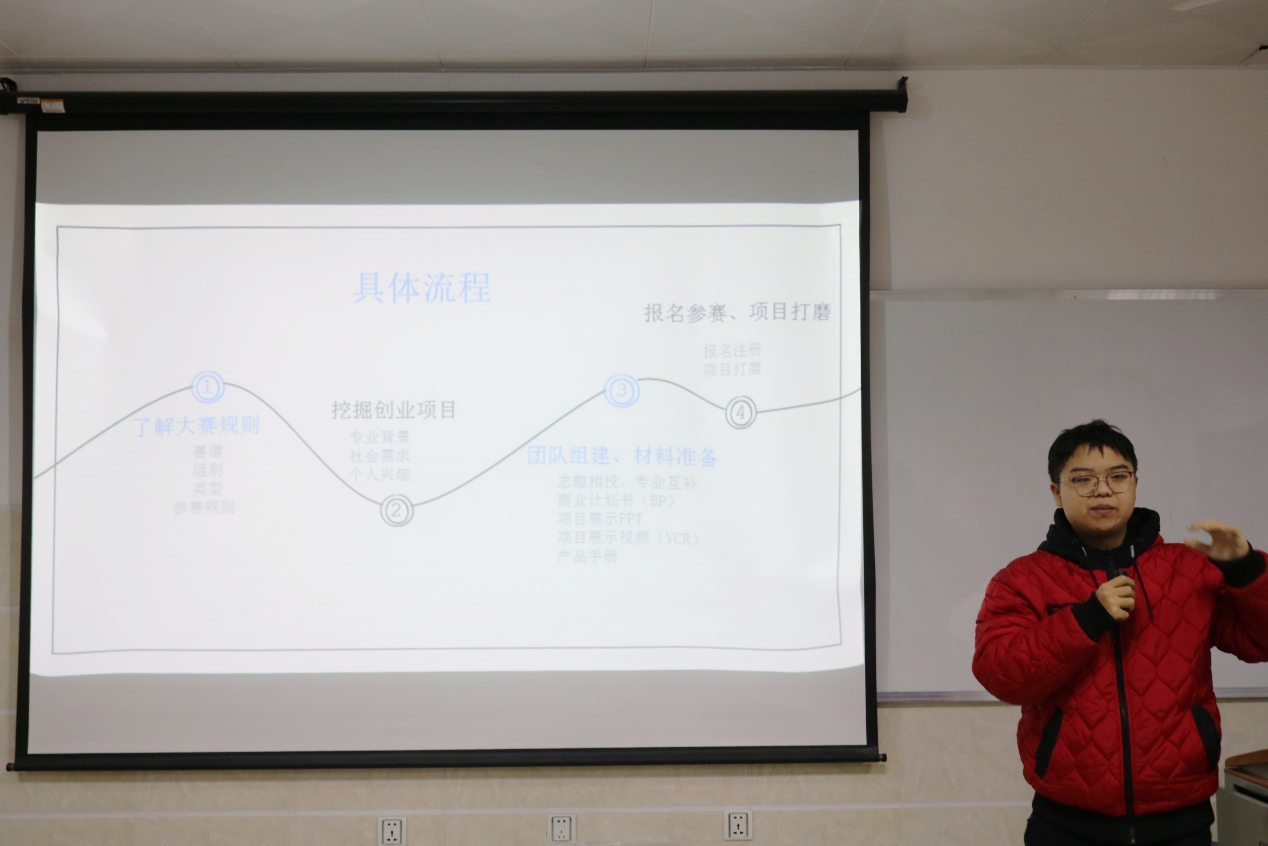 往届参赛代表宋延伦同学为大家详细介绍了大赛的赛程安排、赛制要求、具体赛道方案、项目推荐等有关事项,让大家对大赛有了更深的了解。接着,他还与同为上一届大赛负责人的肖林芳同学对各自所在团队项目进行了详细介绍,从参赛者的角度讲述了自己的独到见解,让大家积累了一定的比赛经验。