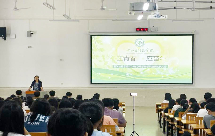 教学科何涛老师解读了学风建设相关要求。她介绍了相关学科的学分的要求和目标,并提供了一些实用的学习方法和技巧。同学们积极参与,纷纷提问和讨论。此外,还邀请了2023级医学技术研究生宋延伦、21检技本班卢梦云和2023级医学检验技术专升本班韦乔珍向同学们分享了他们的学习经验。