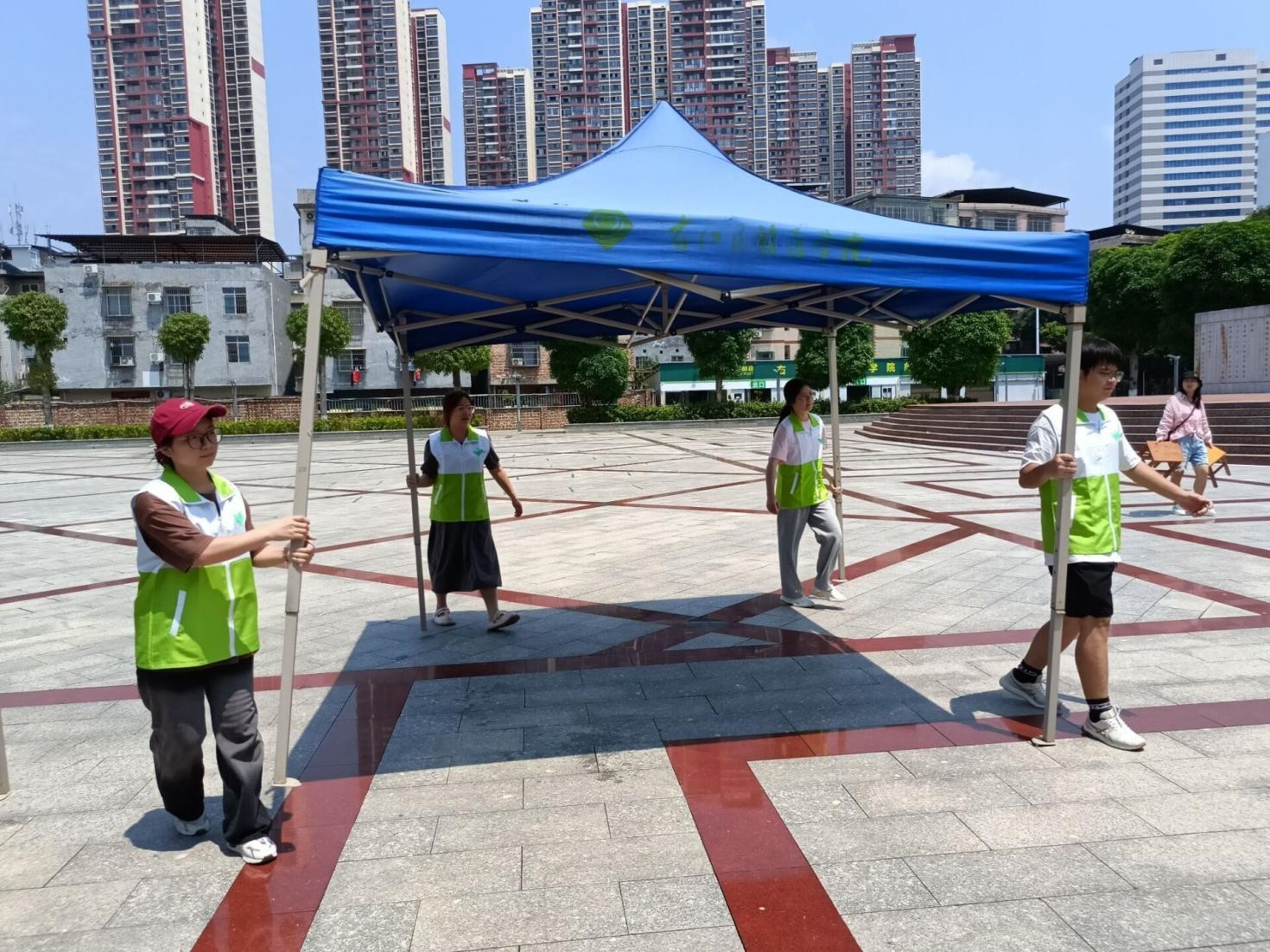 5月23日上午,太阳成集团tyc122ccvip青年志愿者协会太阳成集团tyc122cc分会组织志愿者在百城校区知新广场协助布置公司举行心理游园活动的相关场地。