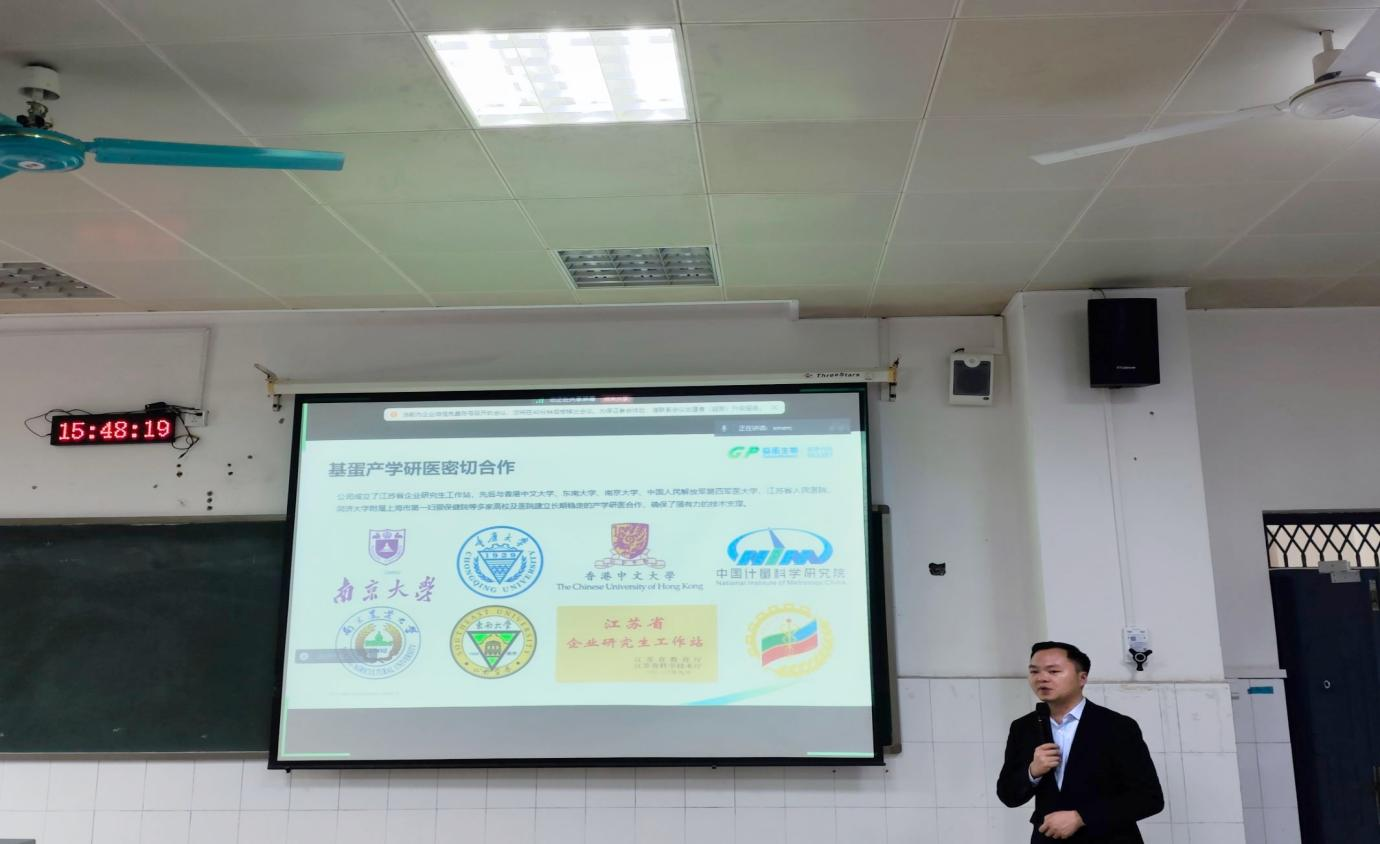 活动现场汇聚多方力量,企业代表与公司师生齐聚一堂。基蛋生物科技股份有限公司人力资源部主任陆路从关于我们、企业文化、组织架构、人才培养体系以及招聘岗位需求等内容,让员工对基蛋生物科技股份有限公司有全面的了解。广西区经理潘松则结合广西区域市场情况,分享基蛋生物产品在当地的应用及市场前景,同时介绍在区域代理运营中的人才需求和职业发展路径,让同学们深入了解了岗位详情、工作内容、职业发展等方面。最后他进行了分享问答,为大家答疑解惑,让大家对基蛋公司更加了解。