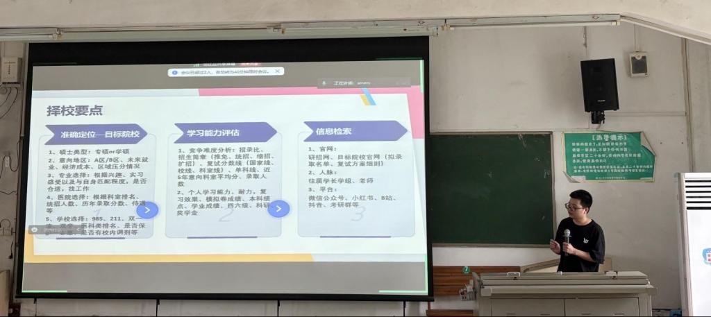 会上,主讲人向同学们传授了考研的宝贵经验和心得。陈艳珠从院校选择、备考工具推荐、各科目备考策略等方面进行了系统讲解,特别强调了研招网等官方信息平台的重要性。她建议同学们综合专业、地区、竞争难度等因素选择报考公司,并推荐了哔哩哔哩、医考帮等学习工具。张汉申则结合自身初试的实战经验,详细介绍了择校方法、初试复试准备技巧,并强调协调实习与考研的重要性。互动环节,同学们积极提问,主讲人就“如何制定高效复习计划”“备考压力如何缓解”等问题给予了详细解答。