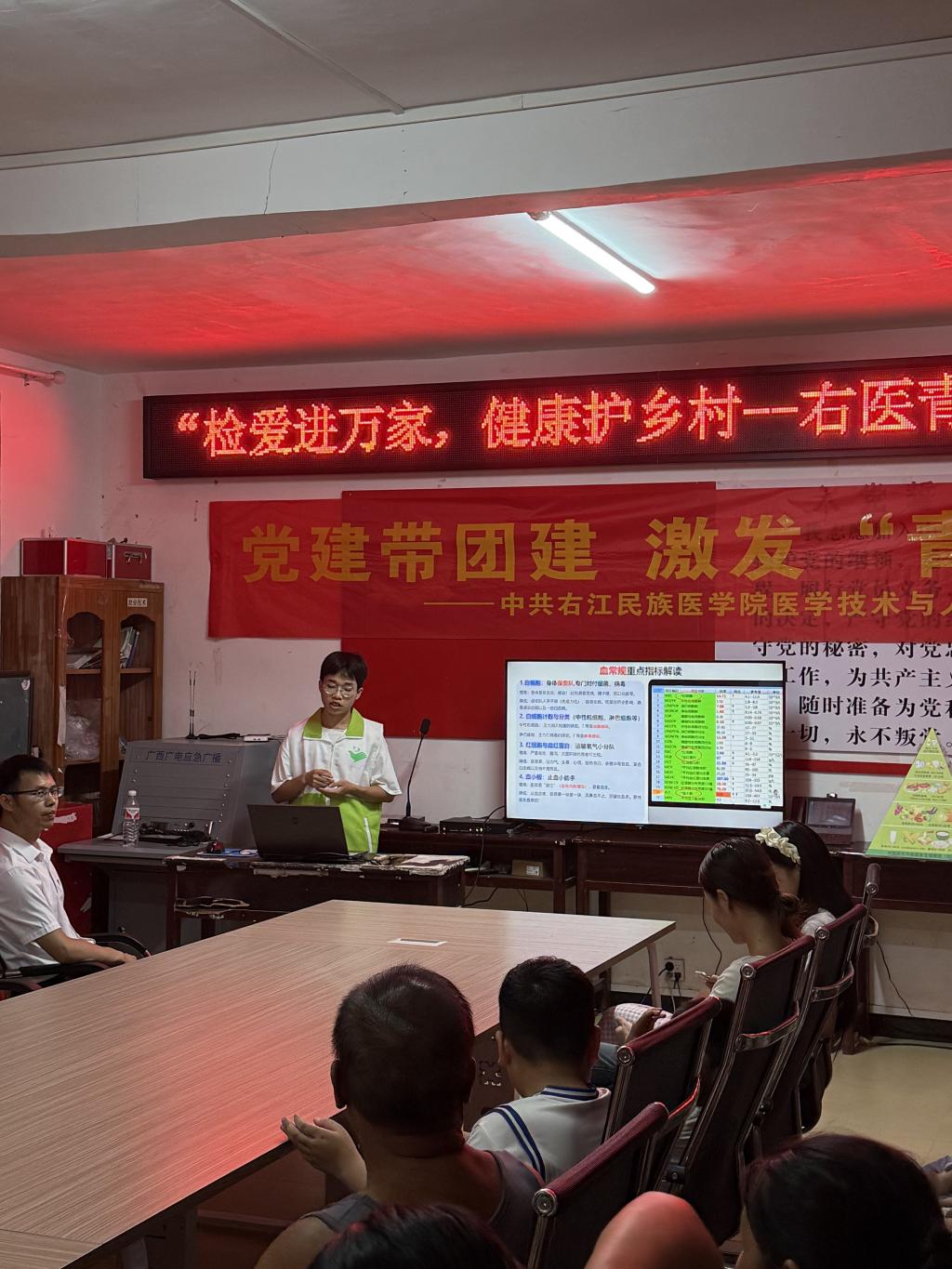 晚上八点半,系列惠民宣讲活动在村支部会议室正式拉开帷幕。志愿服务队围绕村民实际需求,精心准备了防治高血压、膳食营养、化验单解读、人工呼吸及海姆立克急救法五项内容,切实将健康知识送到群众身边。